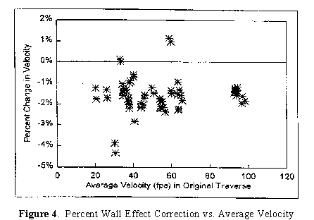 There is no need to conduct wall effects tests at different load levels. Notwithstanding the current dictates of Method 2H, it is not necessary to conduct wall effects tests at different load levels because the effect is Reynolds number independent; that is, it does not vary with changes in velocity. This is supported by fluid dynamics principles and is clearly shown in the data from EPA's own field tests. Figure 4 is a reproduction of a figure(10) from the EPA Findings Report. As stated in the EPA report, the figure shows that "there is no obvious relationship between the percent change in velocity due to wall effects and the average velocity in the baseline traverse."(11) Given the lack of evidence supporting a need for testing at various load levels, we are surprised that EPA requires separate tests in order to apply a measurement based WAF at each level and recommend that EPA reconsider this requirement.