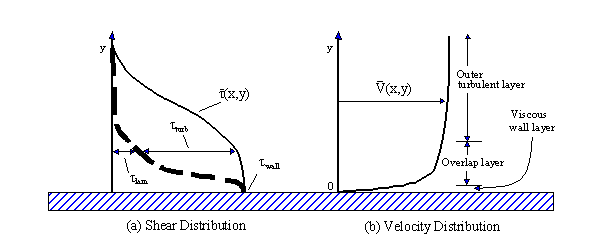 Figure 1. Typical Velocity and Shear Distributions in Turbulent Flow Near a Wall